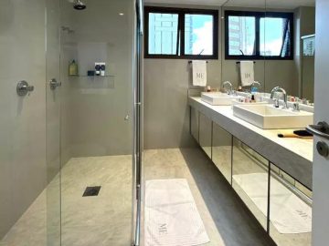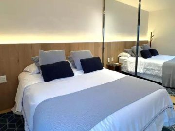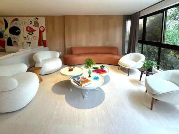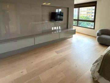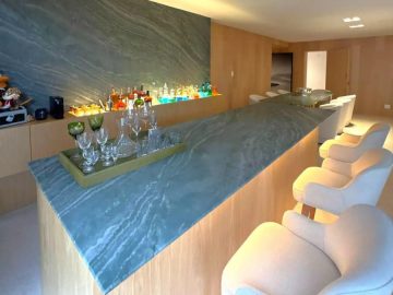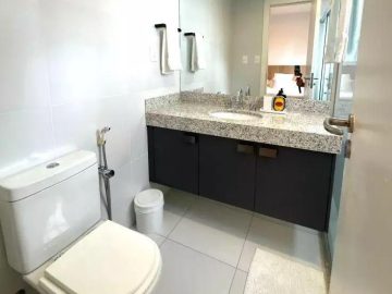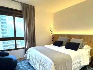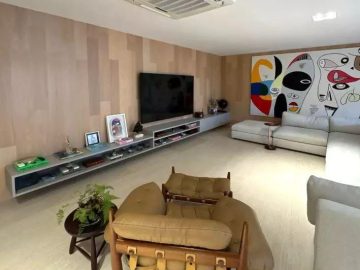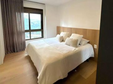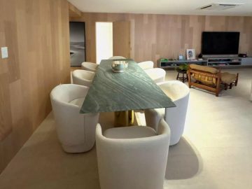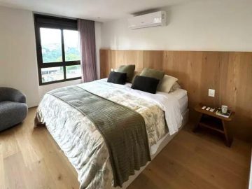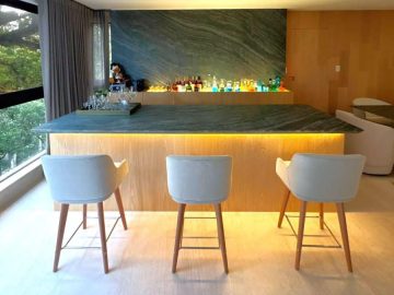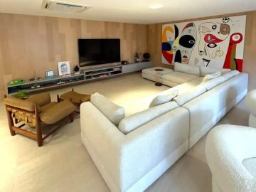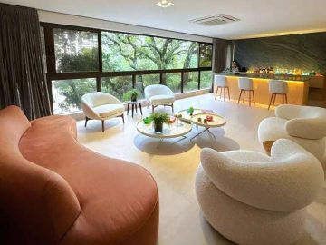 Com sala ampla, lavabo e uma varanda generosa, o imóvel combina elegância e conforto. Os acabamentos são de alto padrão, com piso em limestone, revestimentos em carvalho europeu e mobiliário assinado pela Artefacto, criando ambientes acolhedores e sofisticados.