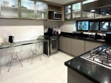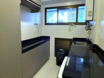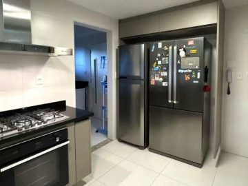 A cozinha possui excelente espaço, equipada com coifa e armários planejados da Florense. A área de serviço também é planejada, com despensa e dependência completa. O apartamento dispõe ainda de 4 vagas de garagem.